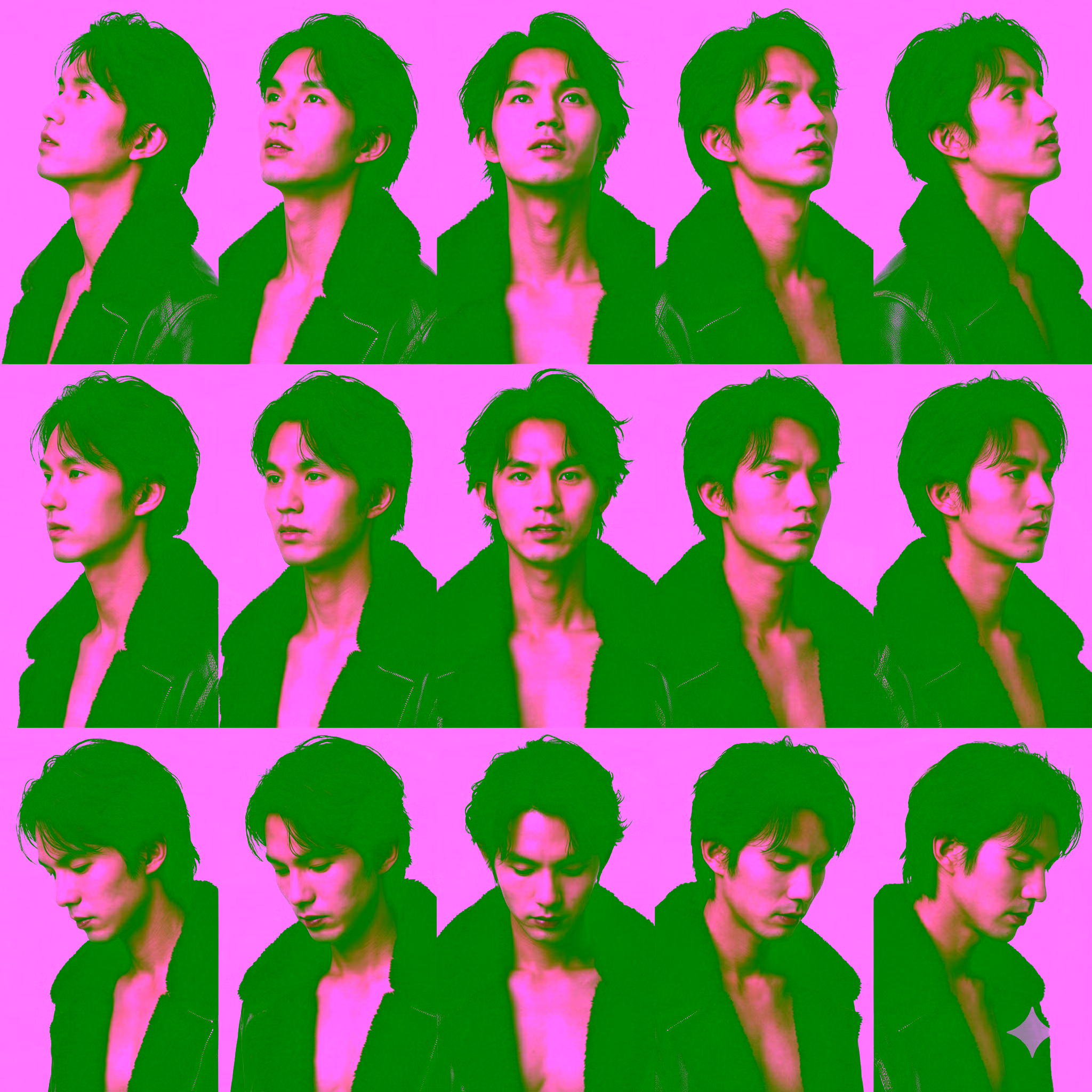 A composition featuring 15 close-up shots from different angles, on a white background, with all shots keeping the subject’s facial features completely consistent and unchanged. Row 1: Upward Angles (Pitch Up / Looking Up) This row simulates the camera shooting from a lower position upward, or the subject tilting their head up.