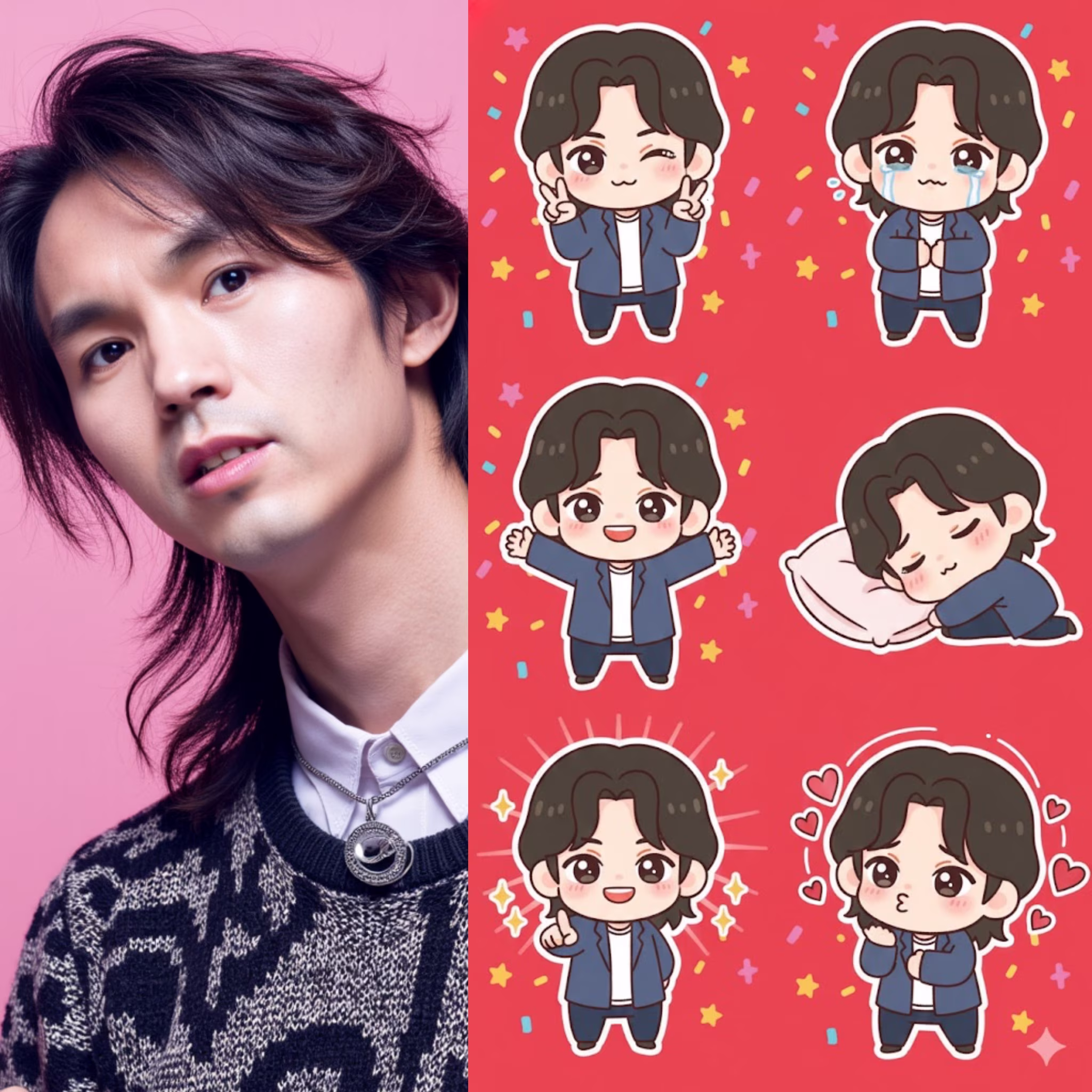 Making a playful peace sign with both hands and winking. Tearful eyes and slightly trembling lips, showing a cute crying expression. Arms wide open in a warm, enthusiastic hug pose. Lying on their side asleep, resting on a tiny pillow with a sweet smile. Pointing forward with confidence, surrounded by shining visual effects. Blowing a kiss, with heart symbols floating around. Maintain the chibi aesthetic. Exaggerated, expressive big eyes. Soft facial lines. Background: Vibrant red with star or colorful confetti elements for decoration. Leave some clean white space around each sticker.