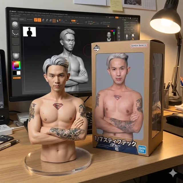 Turn the person in the uploaded picture into a 1/7 scale commercialized figure of the character in the illustration, in a realistic style and environment. Place the figure on a computer desk, using a circular transparent acrylic base without any text. On the computer screen, display the ZBrush modeling process of the figure. Next to the computer screen, place a BANDAI-style toy packaging box printed with the original artwork.