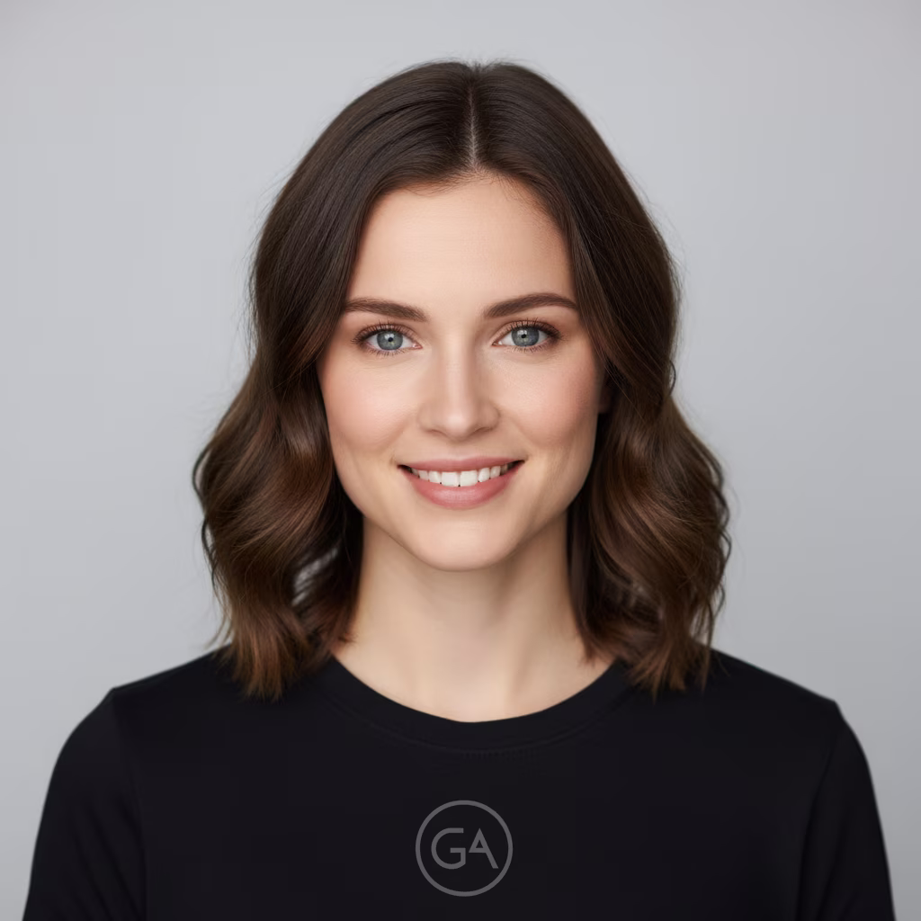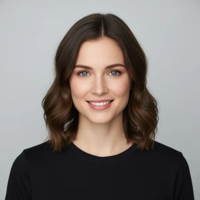 "Take the first image of the woman with brown hair, blue eyes, and a neutral expression. Add the logo from the second image onto her black t-shirt. Ensure the woman's face and features remain completely unchanged. The logo should look like it's naturally printed on the fabric, following the folds of the shirt." Template:Using the provided images, place [element from image 2] onto [element from image 1]. Ensure that the features of [element from image 1] remain completely unchanged. The added element should [description of how the element should integrate].